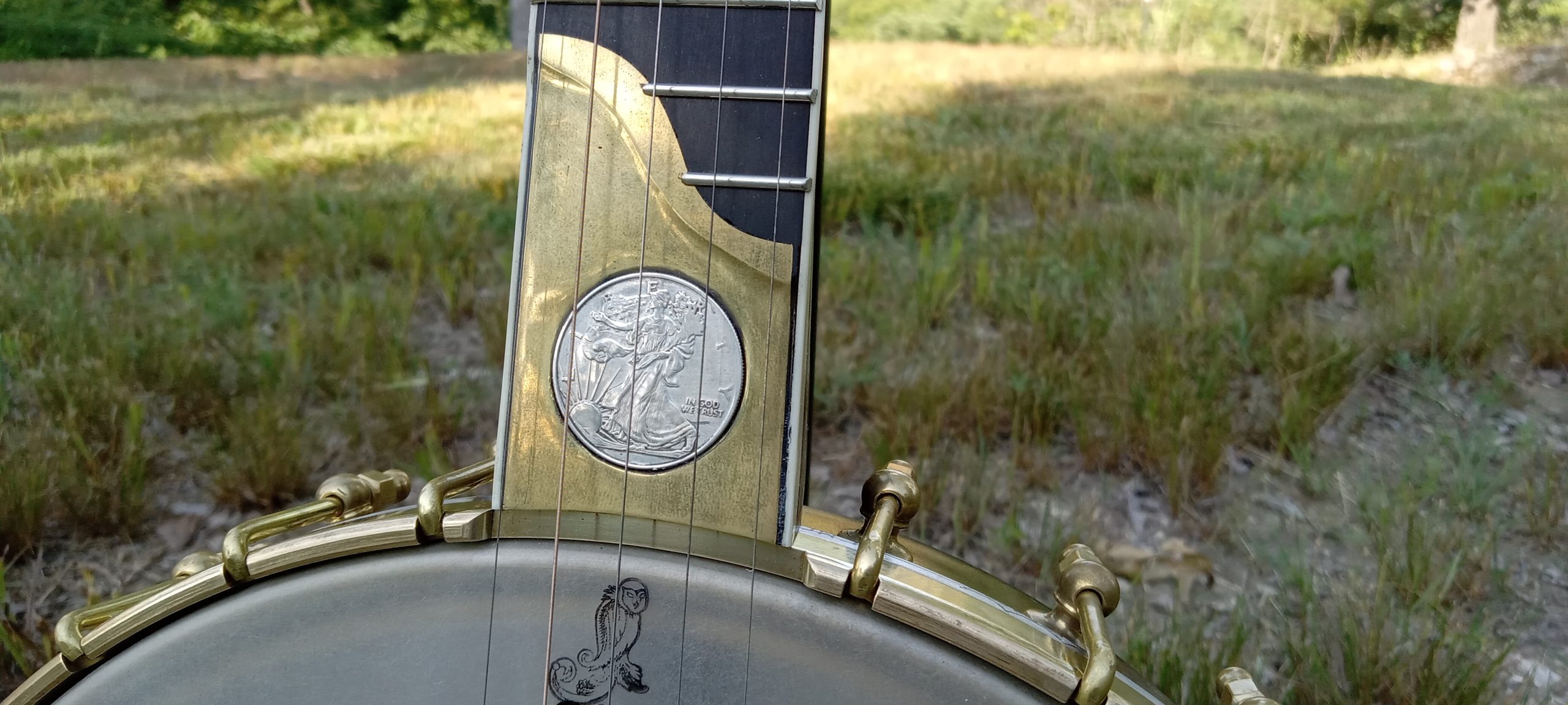This was a custom banjo with a 12″ tubaphone tone ring. Originally built with a half fretless brass onlay, it was later converted to a standard fretted banjo.